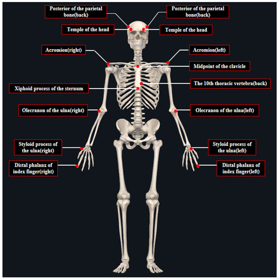 Kinematic data were collected using a Bioengineering Technology and Systems (BTS) motion capture system (SMART DX 700, BTS company, Milano, Italy) that sampled at 100 Hz and was used for action recognition. This system’s resolution is 1.5 million pixels. Markers were applied according to the upper-limb model, which is shown in Figure 2.