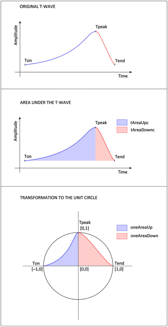 - oneSTTAreaUp: The T-wave is transformed into the unit circle, where the point of the ECG signal [Time(Tpeak), Amplitude(QRSend)] corresponds to the point [0,0] of the unit circle, [Time(Tpeak), Amplitude(Tpeak)] to the point [0,1], [Time(QRSend), and Amplitude(QRSend)] to [−1,0]. Then, the area of the transformed T-wave is calculated analogously to tAreaUpc. The parameter’s value is always positive.