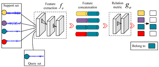 In the learning process of the relation network, the dataset is divided into support set and query set , where and denote the input samples, and and denote the category labels of the samples, respectively. The main role of the support set is to generate prototype features for each category; this process is achieved by superimposing all the sample features under the same category in the support set, i.e., the features of each category are summed element by element to obtain a prototype representation of the category. The query set is then used as a training sample to evaluate the performance of the model on new samples and update the model parameters accordingly. Specifically, the model predicts the category of a query sample by calculating the relationship scores between the features of the samples in the query set and the prototypical features of each category, i.e., it classifies the samples by learning the relationships between them. The process is described as follows: First, maps and to a uniform feature space to obtain and . Then, the features of the support set samples and the query set samples are combined to obtain the combined feature . Finally, is input into the relationship metric to calculate the relationship score :
