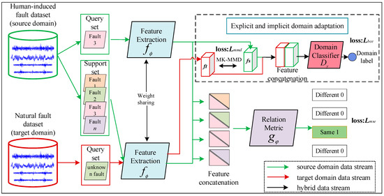 DAMRN is a meta-learning framework designed for human-induced fault to natural fault knowledge transfer, aiming to solve the problem of cross-domain differences between laboratory simulated faults (human-induced faults) and real scenario faults (natural faults), as shown in Figure 2. DAMRN is based on a relation network and incorporates several domain adaptation mechanisms, including explicit distribution alignment and implicit alignment. The multi-kernel maximum mean discrepancy (MK-MMD) explicitly aligns the global feature distributions of the source and target domains. Implicit alignment, on the other hand, confuses the decision boundary of the domain discriminator through adversarial learning, forcing the model to generate domain-invariant features.