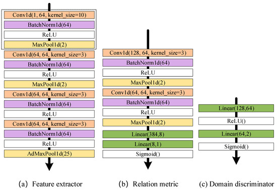 In addition, the detailed parameters of the feature extractor , relation metric , and domain discriminator of the DAMRN are shown in Figure 3.
