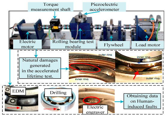 PU [34]: Natural faults were selected from the dataset provided by Paderborn University. The PU’s electromechanical drive system test platform (shown in Figure 5) consists of core components such as electric motors, torque sensing shafts, bearing test modules, inertial flywheels, and load motors. The platform uses deep groove ball bearings of type 6203 as test objects. The data on natural faults are obtained through accelerated life experiments. The data acquisition system synchronously records three-axis vibration signals, motor current signals, and mechanical parameters to form a multidimensional monitoring system, in which the vibration acceleration signals and motor current signals are sampled at a high frequency of 64 kHz, the mechanical parameters (radial load, rotational speed, and torque) are recorded at a frequency of 4 kHz, and the temperature monitoring is collected at a low frequency of 1 Hz. The study confirms that natural damage samples are more closely related to actual degradation mechanisms than human-induced fault samples [35], highlighting their unique value. The sample parameters are detailed in Table 2.