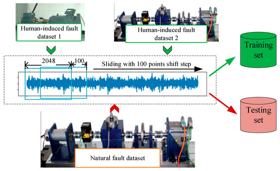In the sample preparation stage, human-induced fault samples are used for training and natural fault samples are used for testing. Particularly worth mentioning is that because the data length is too short, this study refers to the related works [36,37,38] and introduces the sliding window resampling technique (the window step size is 100 data points, and the sampling length is 2048 points), which can obtain a large amount of data. The specific data processing flow is shown in Figure 6. The statistics of the number of training and testing samples are detailed in Table 3, where 700 samples of each class are randomly selected for the training set, totaling 2100 samples each, and 100 samples of each class are randomly selected for the testing set.
