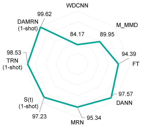 In this section, we focus on the knowledge migration capability of DAMRN from human-induced faults to natural faults in the same machine environment, constructing a D → E migration scenario. In order to fully evaluate the performance of DAMRN, we compare it with a variety of other approaches, including the classical deep network model WDCNN, as well as the baseline models in the field of transfer learning, M_MMD [39], Fine-tuning (FT) [40], and DANN [32]. In addition, we introduced SOTA methods in the field of migration learning, such as MRN [41], S(t) [38], and TRN [42], to ensure that we can more accurately measure the strengths and weaknesses of DAMRN in knowledge migration tasks. All experiments were repeated five times, and the average classification accuracy (%) was used as the evaluation index; the specific results are shown in Figure 7.