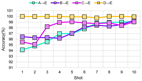 The learning process of DAMRN follows the meta-learning criterion of N-way K-shot. In order to fully evaluate the impact of K-shot on model performance, this paper designed a series of experiments to observe the performance of DAMRN in different tasks by varying the value of K. The experimental results are shown in Figure 8, which demonstrates in detail the average classification accuracy of DAMRN on each task (A → E, B → E, C → E, D → E) with different K settings.