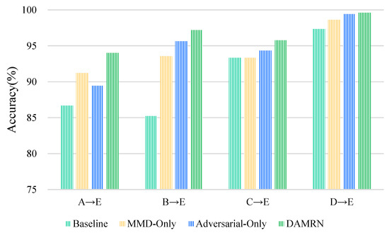 See Figure 9. In all the tasks (A → E, B → E, C → E, D → E), the performance of the Baseline is relatively low, especially in the A → E and B → E tasks, where the gap with the optimal method is significant, suggesting that relying solely on the meta-learning framework cannot effectively overcome the problem of domain bias. Compared to the Baseline, MMD-Only improves its performance in all tasks. Specifically, MMD-Only improves significantly over Baseline in the A → E and B → E tasks but improves limitedly in the C → E task, even close to the Baseline level, reflecting that its explicit alignment relying on statistical distributions is insufficiently adaptive to some of the complex domain differences. Compared to MMD-Only, Adversarial-Only outperforms MMD-Only in the B → E and D → E tasks, suggesting that adversarial learning can dynamically capture the local features of domain differences; however, it is weaker than MMD-Only in the A → E task, probably due to the instability of adversarial training. DAMRN outperforms the other three sets of experiments in all tasks, showing that the simultaneous use of MMD and adversarial domain adaptation can reduce the discrepancy between the source and target domains more efficiently, validating the complementary nature of explicit and implicit alignment. In addition, for both explicit and implicit alignment, we use an example to describe it in Section 3, paragraph 2.