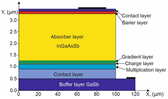 This paper analyzes the performance of npBp barrier APD IR detectors based on a quaternary compound InGaAsSb made of AIIIBV materials, lattice-matched to a binary GaSb substrate. The structure included the buffer GaSb layer, a lower contact and multiplication In0.05Ga0.95As0.10Sb0.90 layer (ML), a charge layer (CL), a gradient layer (GL), an absorber layer (AL) made of the In0.14Ga0.86As0.10Sb0.90, and a barrier layer (BL) made of a ternary Al0.20Ga0.80Sb material with and the upper contact layer built of GaSb. The barrier layer was used to limit the injection of minority carriers from the upper contact side. Its presence reduces the dark current but does not affect the APD operation as much as the multiplication and charge layers. The cross-sections of the 2D structure of the analyzed detector are shown in Figure 1, and the main parameters, described in detail, are presented in Table 2.