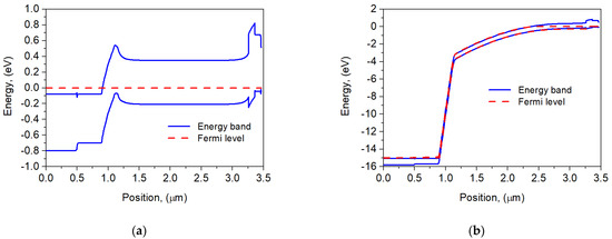 The theoretical simulation energy band profile of the APD is shown in Figure 2. In this structure, an electron barrier is created, allowing for the transport of minority carriers (holes) from the AL to the upper CL while blocking electron transport. However, in the analyzed case, there is also a small potential barrier in the conduction band near the p-n junction, which may block the flow of minority electrons from the AL to the p-n junction and thus reduce the photocurrent. This barrier vanishes at reverse bias U = 15 V [punch-through voltage at which the depletion region extends through the charge layer to the edge of the AL (see dashed Fermi line in Figure 2b)]. Below the punch-through voltage, the photocurrent is typically low because many of the photogenerated carriers in the AL do not have sufficient energy to cross the heterojunction interfaces.
