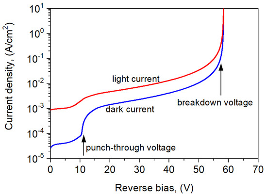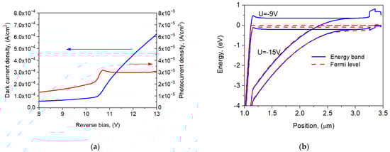 The precise determination of the punch-through voltage requires analysis of the detector band structure and I-V characteristics. Figure 4 shows the dependence of the dark current and photocurrent on the voltage near Upt (Figure 4a) and the shape of the energy bands and the position of the quasi-Fermi levels at the reverse bias of 9 V and 15 V. The punch-through effect on the I-V characteristics appears at a reverse bias of 10.5 V. Below this voltage (for U = −9 V), a small barrier in the conduction band was observed, which disappeared at voltages above −11 V, causing a significant increase in the photocurrent. At the same time, the splitting of the quasi-Fermi levels increases, which at a voltage of −15 V reaches a value comparable to the absorber energy gap. This indicates the expansion of the depletion region to the entire AL. Also, part of the electric field drops in the absorber region, facilitating the transport of electrons to the multiplication region. When the operating voltage is between −15 V and −58.4 V, the APD operates in a linear mode. The number of carriers being multiplicated increases and the photocurrent is multiplied, with a gain of up to 200. When the APD operates between Upt and 95% of Ubr, the photocurrent increases from 3.3 × 10−3 A/cm2 to 9.7 × 10−2 A/cm2, while the dark current increases from 7.8 × 10−4 A/cm2 to 2.7 × 10−2 A/cm2.