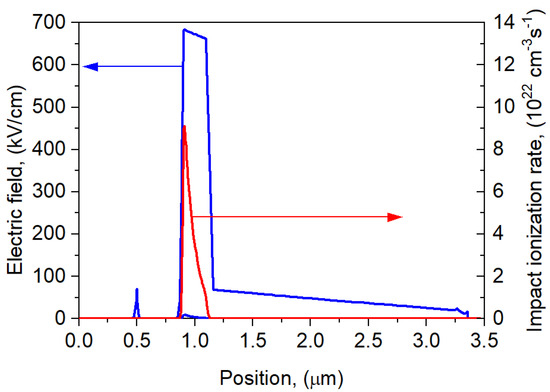 An analysis of the electric field distribution and impact ionization rate was performed. Figure 5 shows the comparison of the electric field distribution and impact ionization rate for the npBp APD with the parameters presented in Table 2 at a reverse bias of 0.95 × Ubr = −55.5 V.