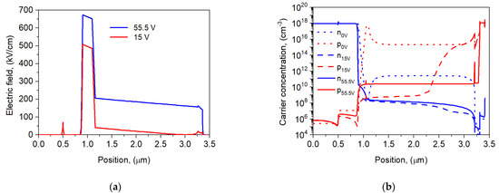 Electric field distribution (a) and electron and hole concentrations at U = −15 V and U = −55.5 V (b) for the npBp APD at 300 K. The position of the equilibrium concentration has been marked with a dotted line.