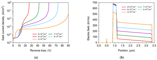 The influence of the charge layer doping on the dark current and electric field distribution for the npBp APD was analyzed, and the results are presented in Figure 7. Figure 7a shows that with higher CL doping, the Ubr is lower but the Upt is higher and the linear part of the I-V characteristic is reduced. This is connected with the decrease in the electric field in the ML versus CL doping, as shown in Figure 7b. The charge layer serves as an electric field control layer, ensuring that the electric field in the ML is sufficient to reach a high gain while simultaneously reducing the field in the AL below the tunneling threshold to maintain a low dark current.