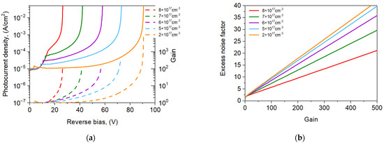 The CL doping significantly affects the photocurrent and APD’s gain. Figure 8a shows the theoretical simulation of the photocurrent density versus the reverse bias for CL selected doping at 300 K. The increase in the CL doping causes an increase in the photocurrent but decreases Ubr (Figure 8a). For voltages near Ubr (0.95 × Ubr), the gain varied from 30 to 40, with the charge layer doping varying from 8 × 1017 cm−3 to 2 × 1017 cm−3. The dependence of the electric field E on the applied voltage was determined, and then the dependence of the k coefficient on the bias was extracted. We can see that in the avalanche multiplication range, the k value changed from 0.02 to 0.08. The k and M allowed us to determine the excess noise factor F(M) according to the relation (1). F(M) is presented in Figure 8b for selected levels of charge layer doping. The excess noise factor increases versus gain and lowering the doping level of the charge layer.