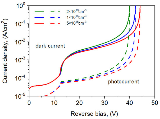 Dark current and photocurrent densities for the npBp APD at T = 300 K for selected ML doping: p = 5 × 1015, 1 × 1016, 2 × 1016 cm−3.