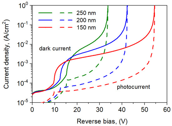 Dark current and photocurrent densities for the npBp APD at T = 300 K for selected ML thickness: d = 150, 200, and 250 nm.