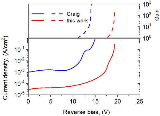 Figure 11 shows a comparison of the theoretically simulated I-V characteristics for the analyzed npBp barrier detectors from our work with literature data according to Ref. [15]. The presented literature data do not correspond to the analyzed structure, i.e., they differ in the stoichiometric composition of the AL and its doping level as well as in the ML material and geometrical dimensions. The In0.22Ga0.78As0.19Sb0.81 absorber had a thickness of 1.4 µm and a p-type doping level of 1 × 1016 cm−3. The ML was made from AlGaAsSb. Hence, this detector was characterized by a breakdown voltage of 15 V and a punch-through voltage of 12.5 V at a temperature of 300 K. In the work [15], IR illumination was carried out using an Eblana Photonics 2.1 μm fiber-coupled laser, but we calculated an illumination power of p = 10 W and a wavelength of λ = 1.55 μm. The gain was defined as the photocurrent ratio at a given voltage to the photocurrent at the punch-through voltage. Minor differences in illumination do not significantly affect the current gain. Figure 11 presents the npBp avalanche detector reaching a significantly (about two orders of magnitude) lower dark current and comparable gain to the detector presented in the literature.