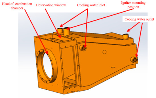 Due to the constraints imposed by the installation position of the igniter and the requirements for the configuration of the observation windows, the dimensions of the observation windows are designed to be 38 mm × 97 mm and 38 mm × 99 mm, respectively. These observation windows enable the measurement of cross-sections ranging from 4 mm to 42 mm from the outlet of the head. High-temperature glass was utilized for the observation windows. For the construction, the 310S stainless steel was selected. This austenitic chromium–nickel stainless steel exhibits excellent oxidation and corrosion resistance, allowing it to operate continuously at elevated temperatures. The wall thickness of the combustion chamber is 3 mm. However, the central temperature within the swirling combustion chamber is relatively high and exceeds the material’s tolerance limit. Therefore, it is essential to cool the wall surface of the combustion chamber. Given the limitations of laboratory conditions, the water cooling method was adopted. Figure 4 illustrates the physical appearance and installation schematic of the combustion chamber.