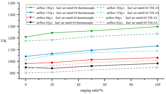 The steady-state temperature of the combustor chamber is defined as the average temperature measured. Figure 6 shows the comparison of temperature measurements between the thermocouple and TDLAS under steady-state conditions. The results indicate that at a fixed fuel–air ratio, the outlet temperature increases overall with rising airflow. When the airflow increases while maintaining the same fuel–air ratio, the corresponding fuel flow rate also increases. The enhanced fuel injection into the combustion extends the fuel spray field downstream and enlarges the reaction zone, thereby elevating the outlet temperature with increased airflow. Under constant airflow conditions, the outlet temperature exhibits a slight upward trend as the staging ratio increases, though the magnitude of this increase is limited. Calculations of thermocouple temperature values across different flow rates reveal a maximum temperature deviation of 4.98% between the 100% staging ratio and 0% staging ratio configurations.