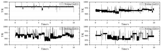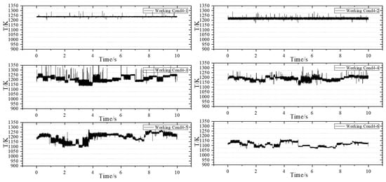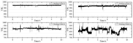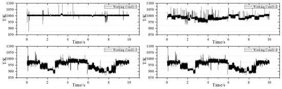 Subsequently, the experiment is conducted under Working Condition 4 to obtain dynamic temperature measurements at 1 kHz. The purpose of implementing Working Condition 4 is to align with the measurement conditions at a frequency of 10 kHz, allowing for a comparison and observation of the detailed changes in temperature at the outlet of the combustion chamber. Additionally, this study aims to investigate the impact of reducing fuel–air ratio on temperature uniformity at the outlet of the combustion chamber while keeping other parameters constant. Figure 10 illustrates the operating condition with an airflow rate of 182.0 g/s.