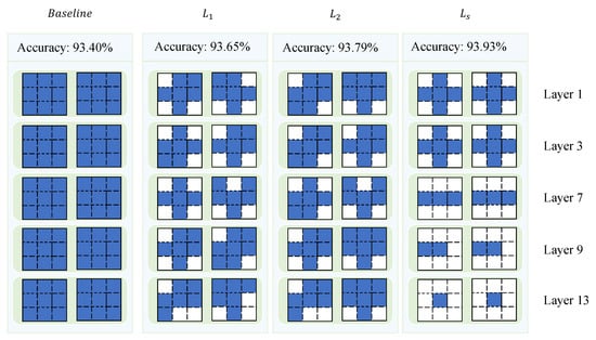 To evaluate the effectiveness of the proposed hybrid regularization method, we conducted an ablation study comparing its performance to that of and regularization. The experiments were carried out on the VGG-16 model using the CIFAR-10 dataset, with a pruning threshold of 0.05 and a regularization strength of for all methods, as shown in Table 7. The results revealed that regularization achieved a classification accuracy of 93.69%, while regularization yielded a marginally higher accuracy of 93.79%. In contrast, the hybrid regularization method, which combines the advantages of both and regularization, achieved the highest accuracy of 93.93%. This demonstrates that the hybrid regularization approach provides a consistent, albeit modest, improvement in classification performance over the traditional and methods. Overall, the findings suggest that the hybrid regularization method strikes a better balance between sparsity and feature retention, leading to enhanced model efficiency and generalization without compromising performance.