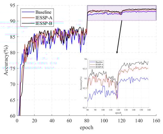 Table 2 presents the pruning results for four prominent network architectures on the CIFAR-10 dataset. The proposed IESSP method effectively reduces both FLOPs and parameter counts by over 50% while maintaining or exceeding baseline accuracy. For example, in the case of VGG-16, the IESSP method achieves a 75.88% reduction in FLOPs and a 94.6% decrease in the number of parameters compared to the baseline model. Notably, the accuracy improves to 93.69%, marking a 0.29% increase over the baseline. Figure 3 presents a comparison of the accuracy changes between the IESSP method and the baseline model. These results demonstrate IESSP’s effectiveness and its potential for deploying VGG networks on mobile and edge devices.