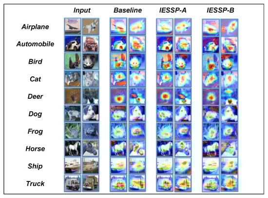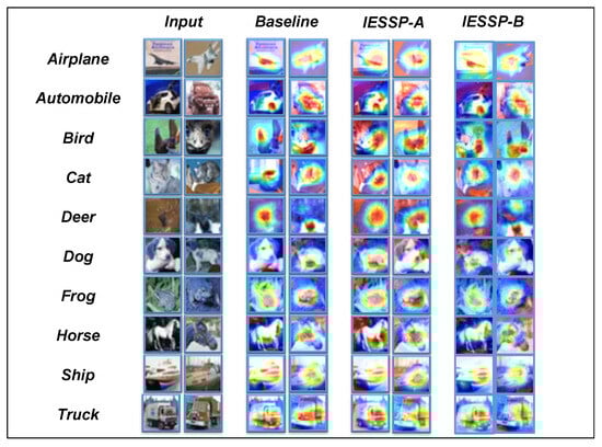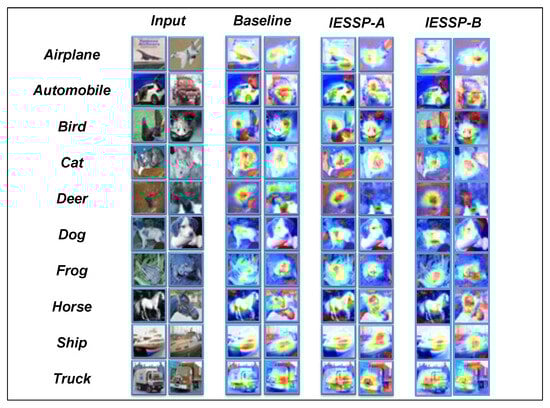 In this study, we introduce Class Activation Maps (CAMs) [] as the primary visualization method for analyzing pruned networks. A CAM is an effective technique for exploring the decision-making process of networks in image classification tasks. By highlighting the regions of the input image that most significantly influence the network’s predictions, CAM provides an in-depth analysis. As demonstrated in Figure 4, Figure 5 and Figure 6, the CAM visualizations on the CIFAR-10 dataset show that the pruned network focuses on the most relevant regions for classification.