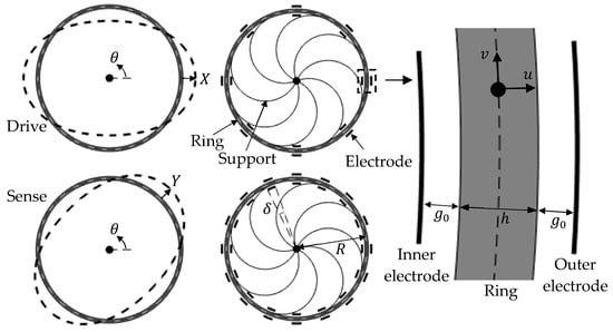 Figure 1 and Figure 2a,b show schematic diagrams of the ring-based devices considered. The ring is supported by eight uniformly-spaced supports, and surrounded by 8 and 16 evenly-distributed inner and outer electrodes. These devices are typical of those used in applications [,] and the operation of the 2 in-plane flexural modes are used as the drive and sense modes, as shown. The dimensions for the ring mean radius , radial thickness , capacitive gap , and electrode angular span are also shown. In practice, the capacitive gap is small () and the ring is thin ().