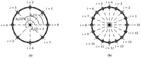 In practice, a voltage is applied to each electrode for the purposes of driving and sensing the ring displacements and tuning the ring modes [,]. To model the voltages applied to each electrode, each outer/inner electrode is identified by an integer index number . The corresponding mean angular position for the th outer/inner electrode is , where , and is the total number of electrodes within the inner or outer electrode sets. The electrode configuration is shown in Figure 2a,b.