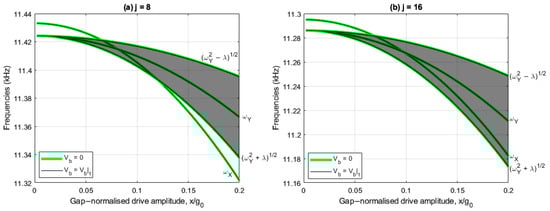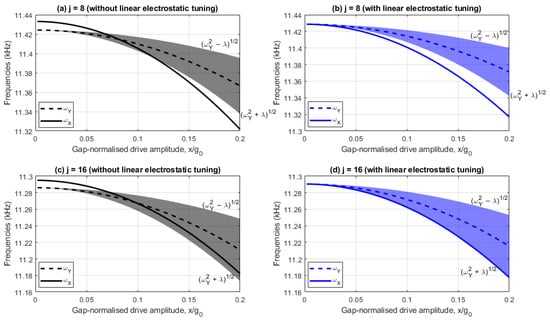 Figure 3a,b show the drive and sense resonant frequencies with and without linear electrostatic tuning implemented, respectively, for the case, whilst Figure 3c,d show the corresponding results for . In these plots, the shaded region represents the range of sense frequencies bounded by self-induced parametric excitation, so any drive frequency lying in the shaded region parametrically amplifies the sense response, and for any drive frequencies outside this region, the sense response is parametrically diminished.