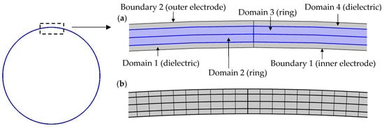 Having considered the drive and sense frequencies as the drive amplitude increases, the effect on rate sensitivity is considered next. In the results to be presented the theoretical results are compared to results obtained using the FE method. The FE results are obtained using the commercial package COMSOL Multiphysics version 6.2 [] and are based on a two-dimensional ring model developed with the ‘Electrostatics’ interface. The FE model used is shown in Figure 4 below.