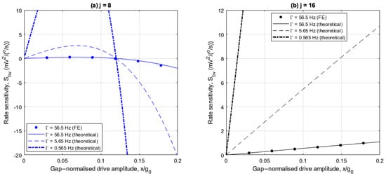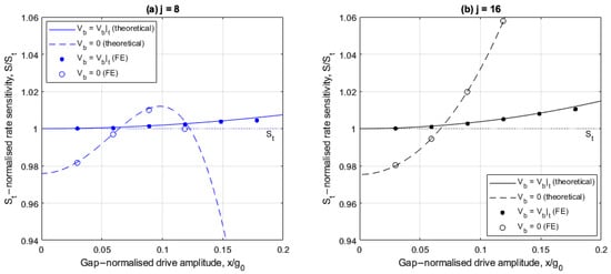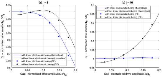 Figure 5a,b show the drive amplitude dependencies of rate sensitivity for cases involving 8 and 16 electrodes, respectively, with and without linear electrostatic tuning. The rate sensitivity is normalized with respect to the corresponding ideal form obtained from (30) with , and low drive amplitudes.