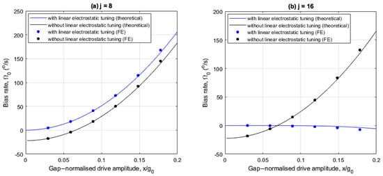 The following investigates the effects of linear electrostatic tuning on bias rate for the 8- and 16-electrode arrangements. Figure 6a,b show how the bias rate varies with drive amplitude, with and without linear electrostatic tuning for the 8- and 16-electrode arrangements, respectively.