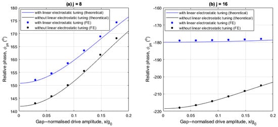 The following investigates the effects of linear electrostatic tuning on the relative phase for the 8- and 16-electrode arrangements. Figure 7a,b show the drive amplitude dependency of the relative phase with and without linear electrostatic tuning for both cases with an angular rate of . In both cases the FE results are in good agreement with the theoretical results.