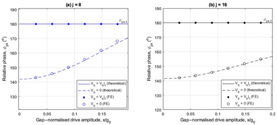 Figure 9a,b compare the relative phase for the 8- and 16-electrode arrangements, respectively, as the drive amplitude is increased with () and without () the balancing voltage when the angular rate is . Similar to the results in Section 4.3 to 4.5, theoretical results are validated against numerical results from FE transient studies. For the FE results, is determined by manually adjusting the balancing voltage amplitude to nullify the quadrature output until a relative phase tolerance of is achieved.