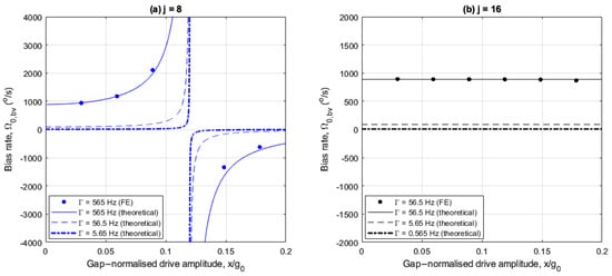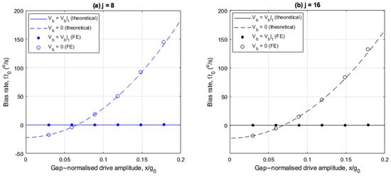 In Figure 6a,b, the imperfections induce a bias rate of at small drive amplitudes for both electrode cases, without linear electrostatic tuning. Also, the FE results are in agreement with the theoretical results.