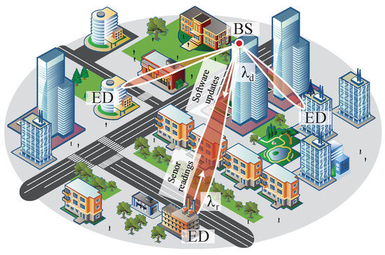 Studies accounting for both the RA and DT phases have appeared only recently. Specifically, such systems were addressed in [24] for IEEE 802.16 [25] systems and, more recently, in [26,27] in the context of general random access systems. Specifically, the authors in [27] extended the model originally proposed in [24] and developed a method for determining the optimal ratio of resources at RA and DT phases to maximize the system throughput. Coexistence between mMTC and human-to-human (H2H) services was considered in [28], where the authors explicitly accounted for RA and DT phases for mMTC traffic and DT phase only—for H2H traffic. As mMTC technology bounds the ED battery lifetime, in [29], the authors explore the possibility that choosing among several low-power wide-area network (LPWAN) technologies integrated at a single ED may improve its lifetime.