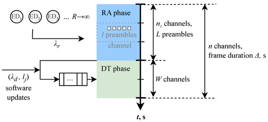 We consider a single base station (BS) serving end devices (ED) located in its coverage and requiring communications in both uplink and downlink directions; see Figure 1. Orthogonal frequency-division multiple access (OFDMA) is assumed. The available bandwidth is B Hz. The system operates in terms of frames with frame duration of Δms. The frame is divided into two parts—random access (RA) and data transmission (DT) phase—as shown in Figure 2. The time–frequency resources are measured in n channels (resource units, RU), where n is calculated according to the Nyquist theorem, . Thus, out of n RUs, RUs are allocated to the RA phase, whereas the remaining RUs are assigned to the DT phase. A single RU corresponds to the time required to transmit a single packet.