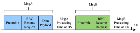 We consider and compare two access schemes: one that utilizes EDT and one that does not. In contrast to the four-step RA scheme specified in 3GPP Release 17 [31], in which each ED must initially transmit Msg1 to secure an uplink grant for the transmission of Msg3, the two-step RA scheme enables each ED to convey both Msg1 and Msg3 in a single message, designated as MsgA, without the necessity of an uplink grant. Consequently, the two-step RA scheme aligns with grant-free random access, whereas the four-step RA-SDT scheme corresponds to grant-based random access. As Figure 3 [15] illustrates, each node transmits its data payload along with the preamble in MsgA. If the random access response (RAR) message and the radio resource control (RRC) release message are received within the MsgB response window, then the node knows that its MsgA transmission has been successful.