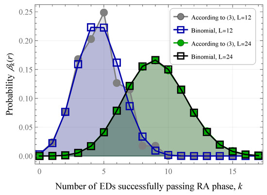 The system in (11) is solved numerically to obtain the stationary probabilities of , which, in turn, allow the derivation of the probability that k EDs successfully pass the RA phase and move to the DT phase in one frame. Each ED independently of the others remains in the RA phase with probability for early transmission, and with probability it goes to the DT phase. Let there be i independent elections, where each ED has an equal chance of entering the DT phase independent of the others. If there are i such EDs, the probability that k of them will switch to the DT phase follows a binomial distribution. Then, the probability can be calculated as