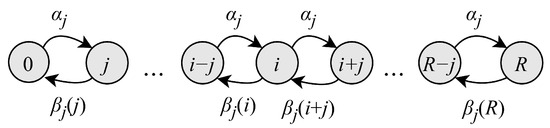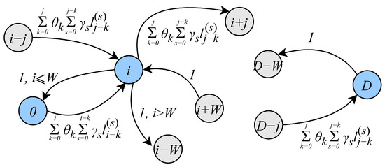 Consider the Markov chain representing the packet service process in the DT phase. At each frame, there are k packets arriving from the RA phase with probability and i batches of packets arriving directly to the DT phase with probability . Recall that the number of packets in a batch is distributed according to the pmf . However, note that, at most, W packets can be transmitted in each frame. Consequently, the transition probabilities take the form of (15), where is the probability that s batches contain i packets, and are evaluated as s-fold convolution of the initial distribution . A part of the state transition diagram of the DT phase Markov model with associated transitions is shown in Figure 6.