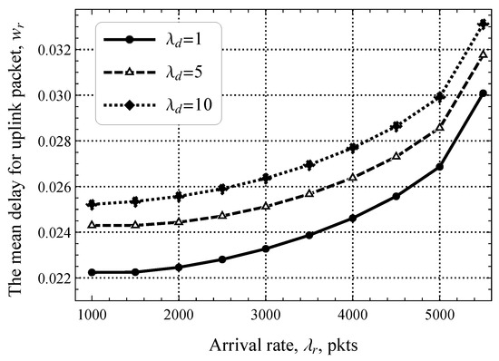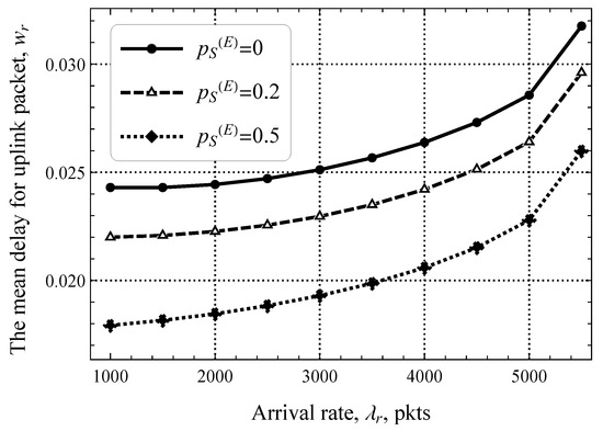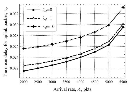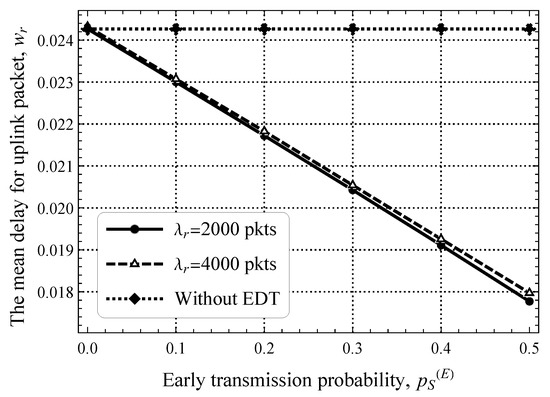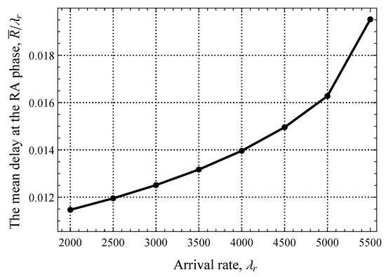 We begin by reporting the performance of the system where the amount of resources allocated for the RA and DT phases is fixed and no EDT regime is utilized. To this end, we start with the delay at the RA phase illustrated in Figure 7, where only uplink packets are present. Note that here and in what follows, we show the results for the stable system conditions that are assessed by utilizing the criterion provided in Section 4. Here, we observe a typical behavior of a system with decentralized access in stable conditions—as the arrival rate of EDs generating traffic in the uplink direction, , increases, the mean delay increases exponentially. We specifically attract attention to the fact that, for a wide range of values of , the mean delay stays extremely low and changes insignificantly, by just 6 ms. This implicitly highlights that, even for pkts/s, the RA phase remains underloaded.
