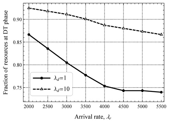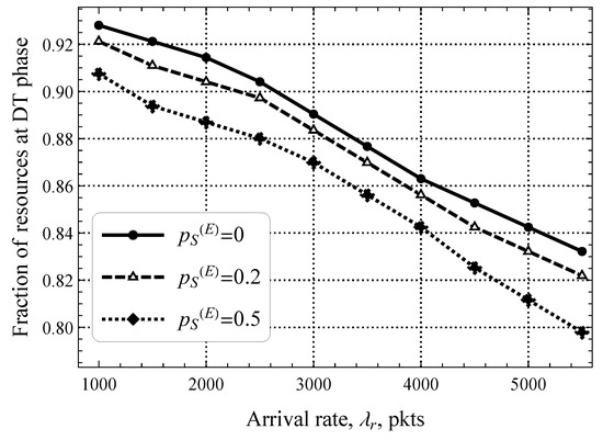 Figure 9 shows the optimal fraction of resources (in terms of the minimal mean uplink delay) that need to be allocated to the DT phase as a function of and two software update intensities, upd./s and upd./s. As one may observe, the optimal division of resources varies drastically depending on the arrival rate of packets in the uplink and downlink directions. The current allocation utilized in 4G/5G CIoT systems is closer to the case when the DT phase is highly loaded with software update traffic ( upd./s, ≈30% of DT utilization). For more realistic loads in the downlink direction, the capacity of the DT phase must be kept smaller to accommodate more packets in the uplink direction as the RA phase becomes a bottleneck.