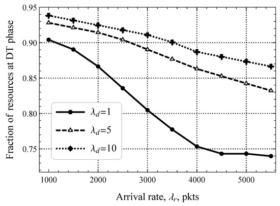 In previous illustrations, we have seen that both the rate of software updates in the downlink direction and the packet size threshold significantly affect uplink packet delay. However, these illustrations were prepared by assuming a fixed distribution of resources between the RA and DT phases. Now, we demonstrate the optimal allocation of these resources as a function of the parameters and in Figure 12 and Figure 13, respectively. Starting with the former, plotted for different and fixed , we observe that the optimal fraction of resources allocated for the DT phase varies drastically, that is, the range of values is 0.75–0.95, which deviates significantly from the default division. Getting deeper into details, we highlight that the joint impact of and is important. Specifically, for small values of , the difference between the fraction of resources that must be allocated for the DT phase between upd/s and upd/s is just . However, for , it was already .