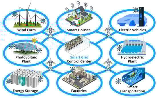 An overview of smart energy grids is presented in Figure 1, pointing out the essential role of batteries (and more generally of EESs) within the system, along with renewable energy sources like photovoltaic power plants, wind farms, and hydroelectric power plants. Figure 1 also highlights the presence of a wireless sensor network infrastructure, which is essential to monitor and manage all the different complex elements of the smart grid.