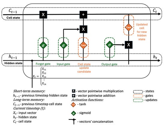 The ML implementation is based on an LSTM network. The LSTM model was selected following a comparison with the Autoregressive Integrated Moving Average (ARIMA) model. ARIMA demonstrated limitations in handling nonlinear degradation trends, as it does not dynamically adapt to evolving degradation patterns and requires periodic retraining, particularly when dealing with non-stationary datasets, as discussed in [,]. In the domain of NNs, LSTMs are specifically designed and optimized for sequential time-series prediction, making them a more suitable choice for accurately modeling the complex degradation behavior of lithium-ion batteries. LSTMs are particularly well-suited for time series forecasting tasks due to their ability to retain long-term dependencies in sequential data. This capability enables the model to effectively capture patterns in battery degradation over time, improving the accuracy of SOH prediction and RUL estimation. Figure 2 provides a complete representation of the LSTM architecture based on the first time that the concept was introduced []. The cell state () acts as the long-term memory of the network, preserving relevant information across time steps while being selectively updated by the gates. The () represents the short-term memory and serves as the output and input of the LSTM at each timestep, influencing both the next hidden state and the final prediction. The previous timestep hidden state and previous timestep cell state provide historical context by carrying forward information from past inputs. The input vector ( represents the current timestep’s data and is concatenated with the previous hidden state to compute gate activations. Operations such as vector pointwise multiplication and vector pointwise addition regulate how much past and new information should be retained or discarded in the cell state. The tanh activation function is used to scale values within a range of [−1, 1], ensuring stable gradient propagation, while the sigmoid activation function outputs values between 0 and 1 to control the degree of information flow in the gates. Lastly, vector concatenation combines the input vector and previous hidden state, allowing the model to process both current and past information simultaneously. Together, these elements enable LSTMs to capture long-term dependencies in sequential data, making them well-suited for applications such as battery SOH prediction and RUL estimation. In an LSTM, the states (black dotted lines), gates (orange dotted lines), and updates (green dotted lines) work together to regulate information flow and maintain long-term dependencies in sequential data. The cell state serves as the memory unit, preserving relevant information across time steps, while the hidden state acts as the short-term representation that influences both the next hidden state and the final output. The gates control the flow of information.