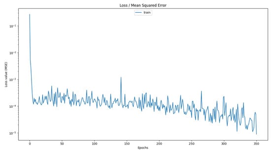 After analyzing the results, a detailed discussion regarding the operating scenario with EP can be conducted. It was observed that the best predictive performance was achieved when using the minimum quantity of training samples, which in this case consisted of 50 records. This finding highlights the potential of achieving accurate SOH estimation with a reduced dataset, which is particularly beneficial in practical applications where data collection may be limited or costly. Furthermore, across all scenarios that give the best performance, the optimal architecture consisted of only two LSTM memory layers. Additionally, it was found that the most effective models were those configured with a relatively small number of units per layer, reinforcing the idea that an excessively large network does not always yield superior results. Another critical observation from the results was that some of the best performing models do not require the full 500 epochs to converge. An example is shown in Figure 5 in the case of the MLP scenario with three LSTM layers trained with SE (the Y axis is on a logarithmic scale).