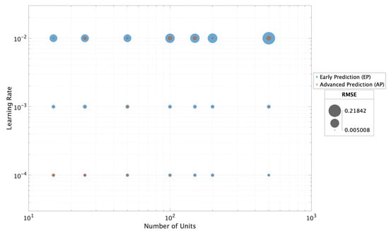 Figure 6 illustrates the relationship between different learning rates (0.01, 0.001, 0.0001) and the number of units (15, 25, 50, 100, 150, 200, 500) tested in the model training process. The size of each data point represents the RMSE metric obtained after testing, where larger points indicate higher RMSE values and lower performance, while smaller points correspond to better models. This graph was generated using all the results obtained from tests made in the EP and AP operating scenarios, where models were trained with 50 and 110 records, represented in blue and orange, respectively. The graph shows that the EP scenario exhibits a higher RMSE, likely due to the smaller amount of training data used. However, it is important to note that for models with 15, 25, and 50 units and a learning rate of 0.0001, the RMSE values were similar across both scenarios, indicating that the quantity of training records had minimal impact under these specific conditions.