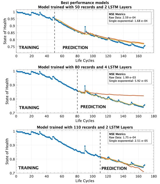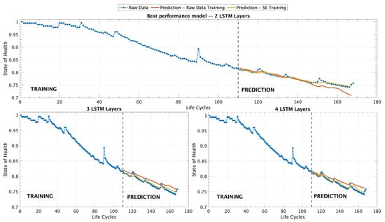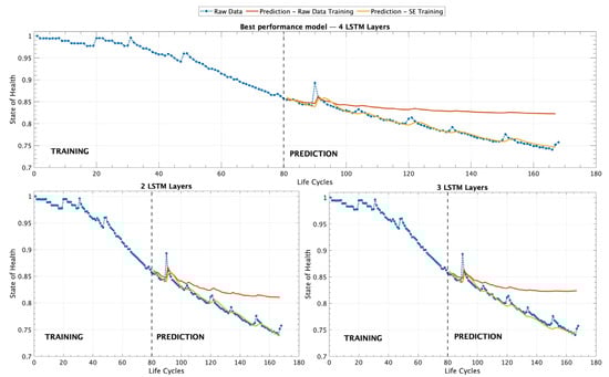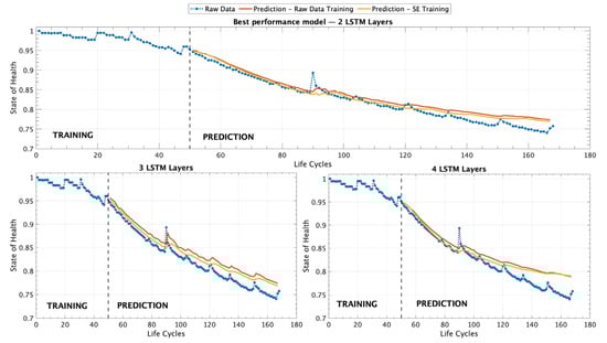 Figure 7 presents a set of three graphical representations that illustrate the predictive performance of the different LSTM architectures tested in this study. The first graph, on top, corresponds to the model that demonstrated the best overall performance, which is composed of two LSTM layers. This architecture outperformed the other configurations in terms of accuracy and predictive capability, as evidenced by the evaluation metrics reported in Table 5. The superior performance of this model suggests that a simpler structure with two layers is sufficient to capture the underlying patterns of battery degradation effectively. The second and third graphs in Figure 7 correspond to the results obtained from models with three and four LSTM layers, respectively. However, the results indicate that while these deeper architectures were able to learn from the training data, they did not surpass the accuracy achieved by the two-layer model. The comparative analysis presented in Figure 7 highlights the importance of selecting an optimal model architecture and hyperparameters that balance complexity and the generalization capability, ensuring that the predictive model remains both accurate and efficient for battery SOH estimation.