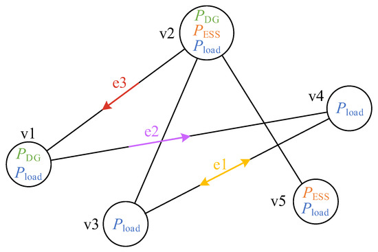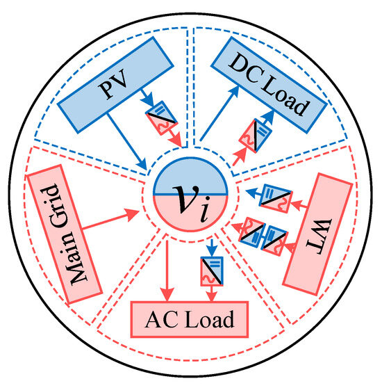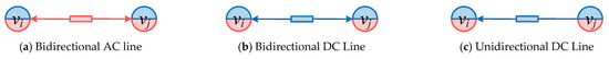 - Bidirectional DC Line: This line represents a connection between two vertices through a bidirectional converter, which is embedded within the vertex, allowing for a bidirectional flow of the direct current. This type of edge facilitates the scheduling and control of the DC power flow, making it suitable for interconnecting DC loads. It is a key component to plan and construct in the expansion of the network.