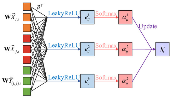 - Edge Features: For edge features in the graph, each edge is defined as a three-dimensional vector containing information on the existence, type, and length of the edge. The feature of edge at time t is represented as shown in Equation (10).